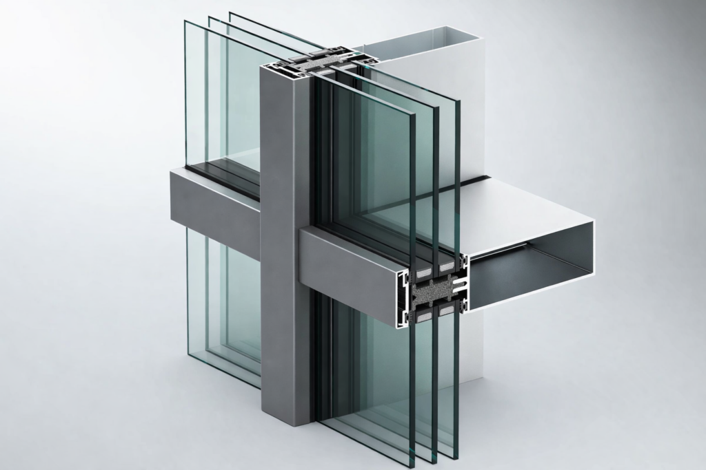 A sleek aluminum framing system that integrates naturally with contemporary office buildings, hotels, retail developments, and mixed-use architecture. Aluminum curtain wall systems are engineered for long-term performance, resisting weather exposure while maintaining structural integrity and visual appeal.